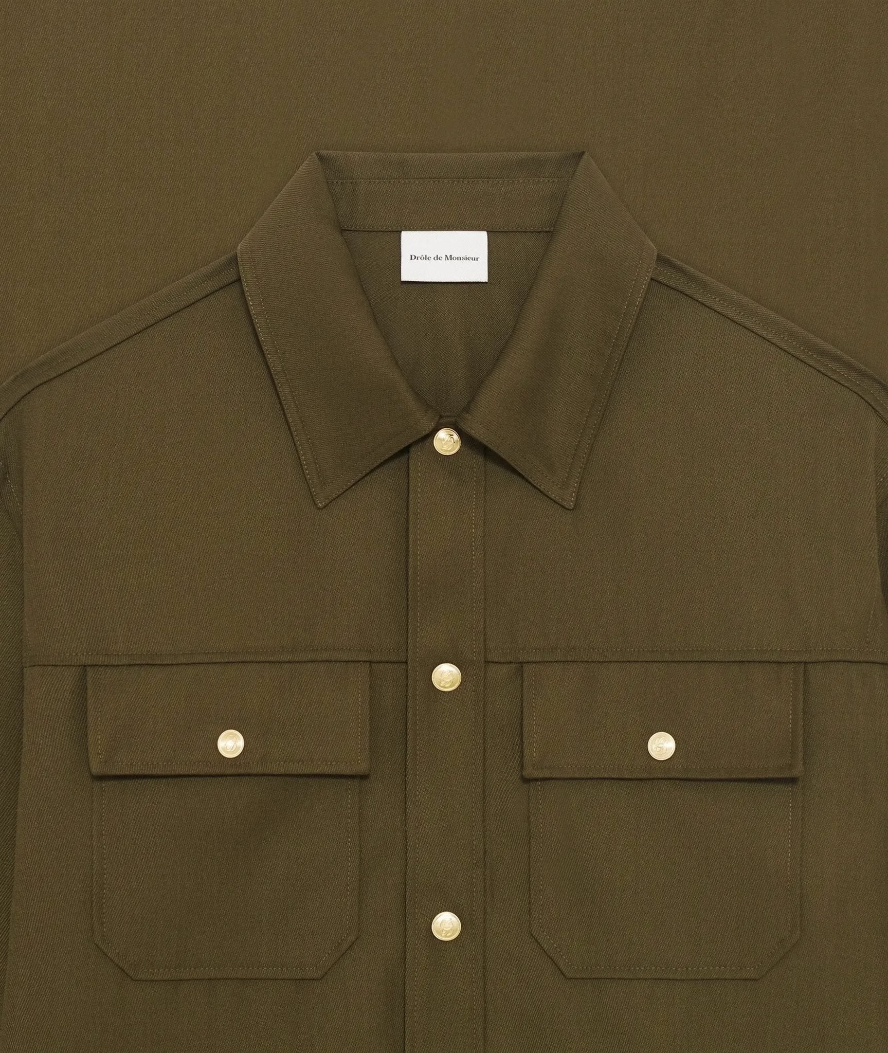 This khaki wool blend overshirt has two flap pockets on the chest, buttoned cuffs and five 'D' mirror snap buttons on the front.