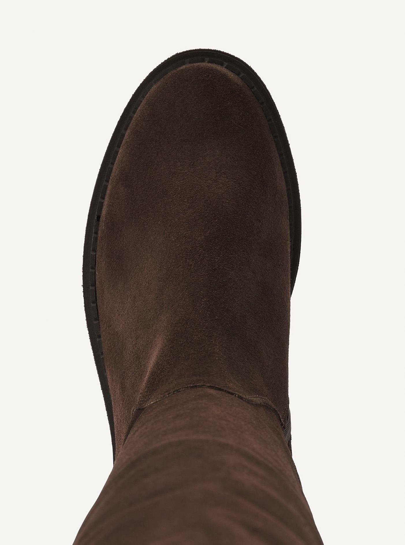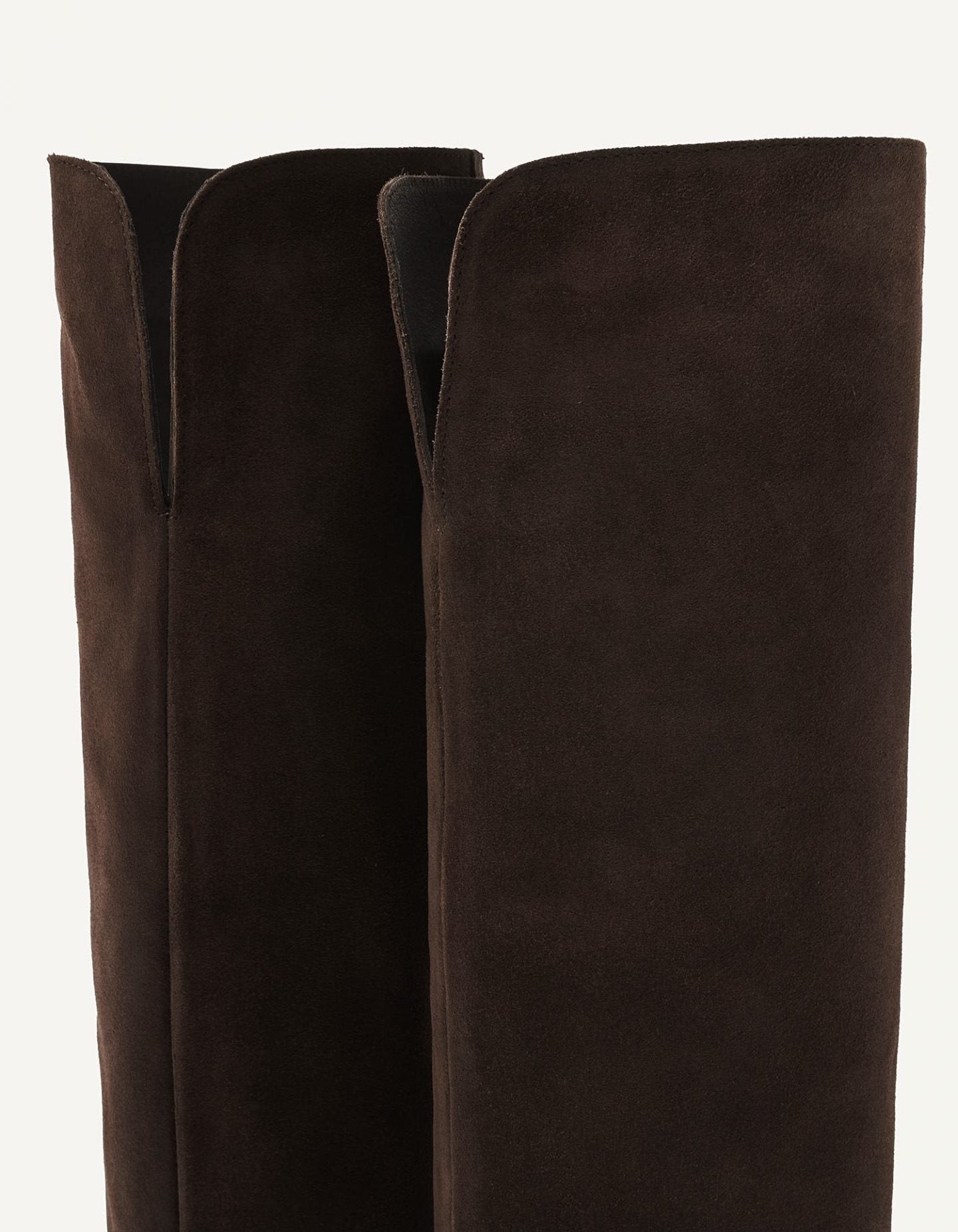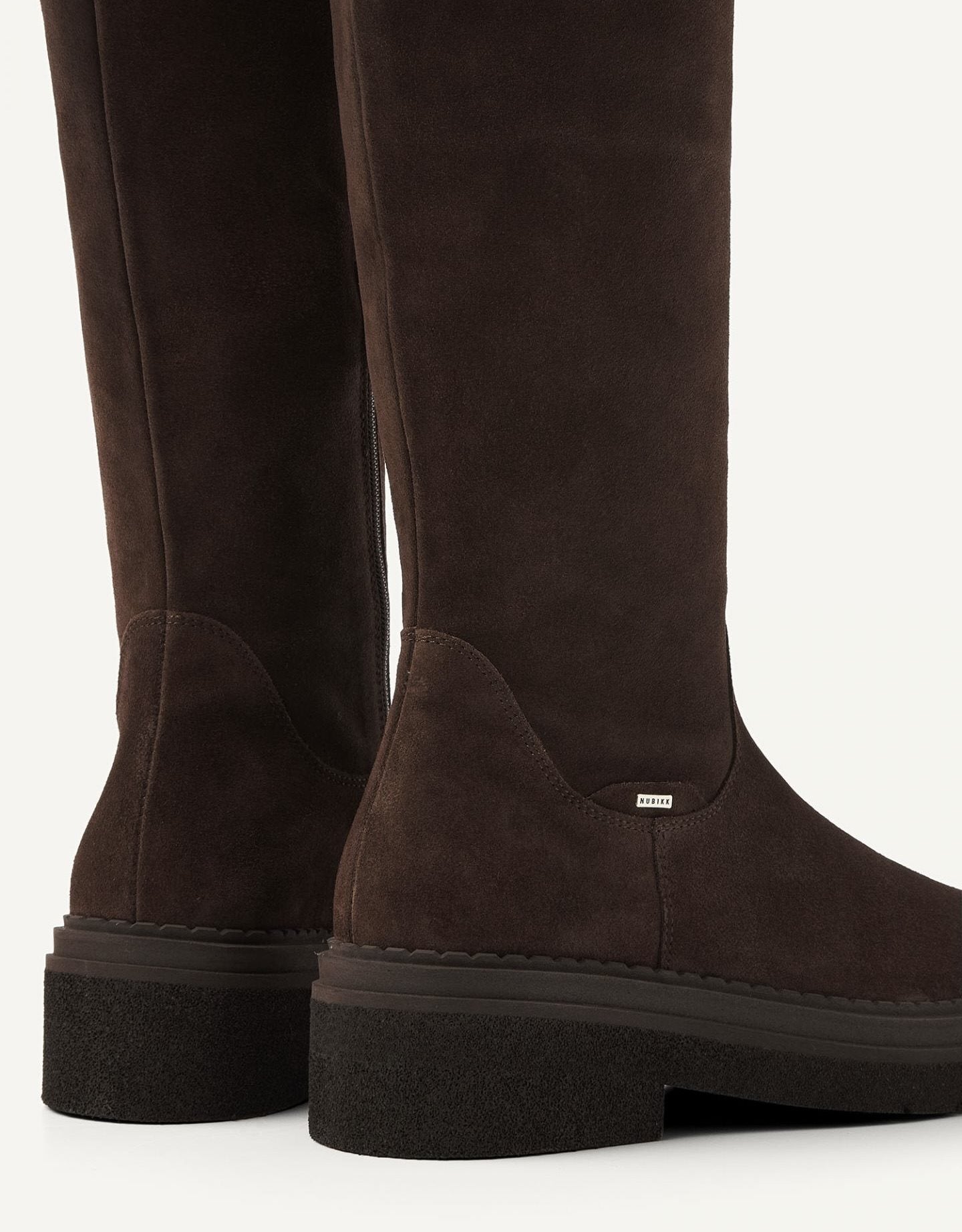 Meet the Liz Eiffel in dark brown suede. These over-the-knee boots offer the perfect blend of classic elegance and modern flair. Made from premium, supple dark brown suede, the Liz Eiffel features a sleek silhouette with a subtle split at the back for a perfect fit around the knee. Equipped with a NUBIKK heat-stamp logo and a lightweight EVA sole for added comfort. A discreet inner zipper makes them easy to put on and take off, making these boots as practical as they are stylish.