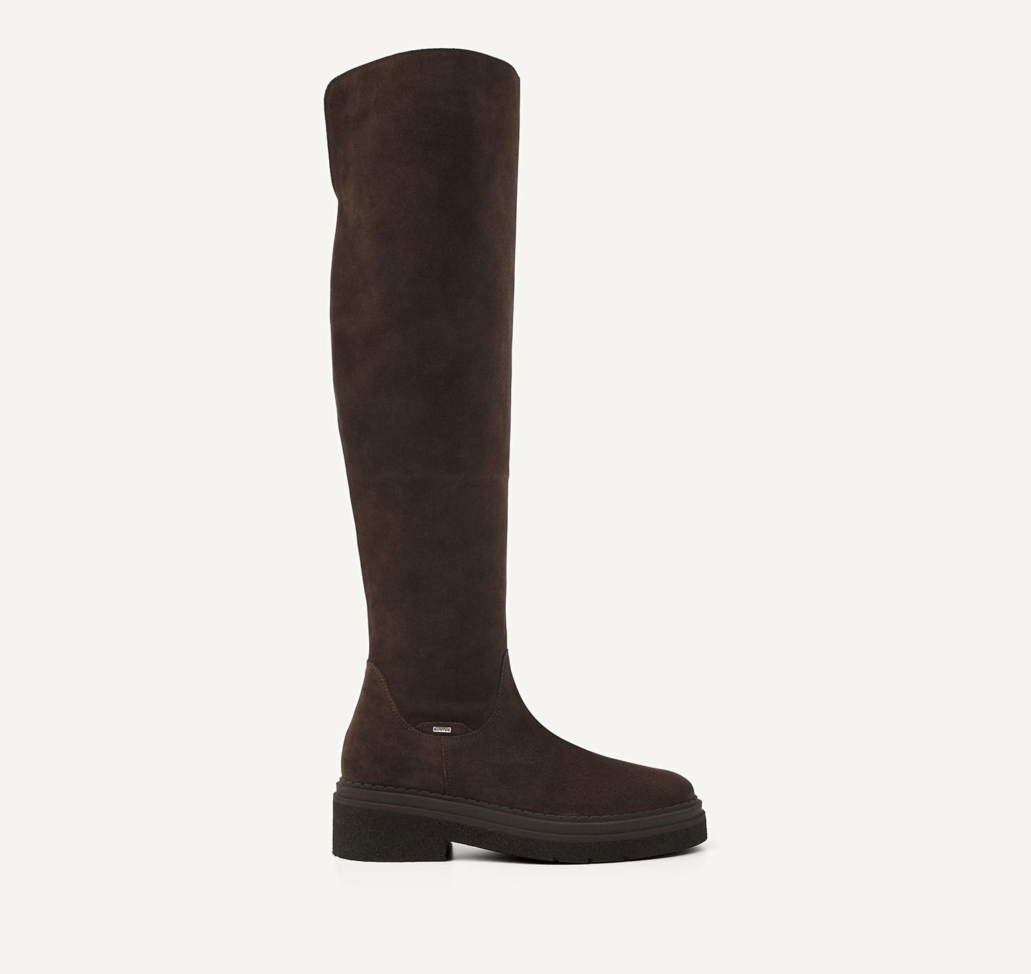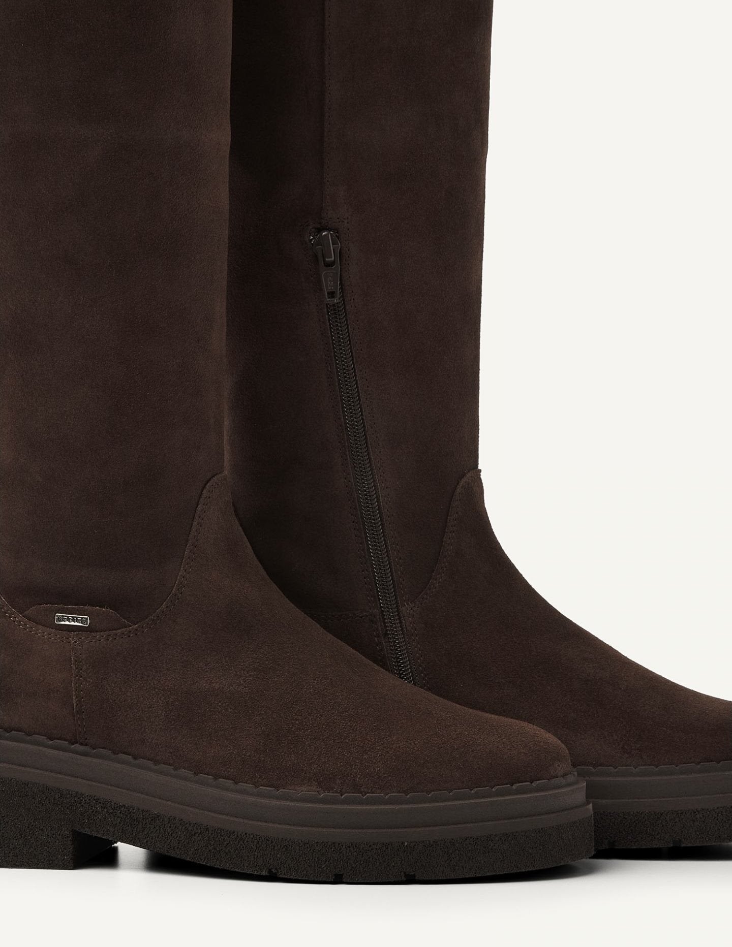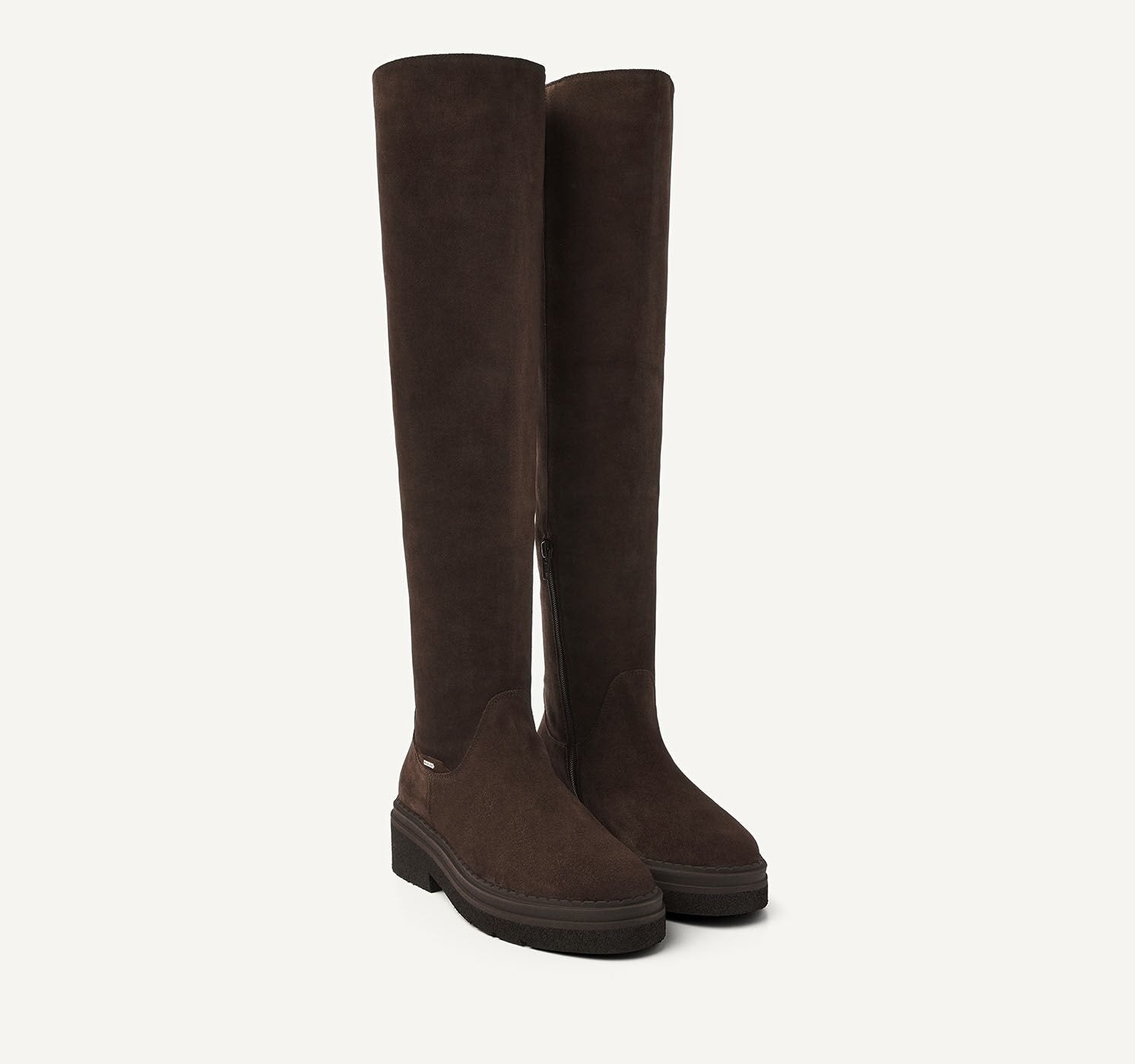 Meet the Liz Eiffel in dark brown suede. These over-the-knee boots offer the perfect blend of classic elegance and modern flair. Made from premium, supple dark brown suede, the Liz Eiffel features a sleek silhouette with a subtle split at the back for a perfect fit around the knee. Equipped with a NUBIKK heat-stamp logo and a lightweight EVA sole for added comfort. A discreet inner zipper makes them easy to put on and take off, making these boots as practical as they are stylish.